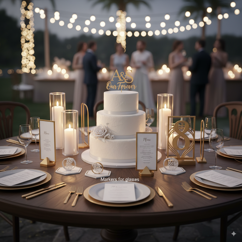 Además, contamos con accesorios decorativos como toppers para tartas, marcadores de copas, portamenús o centros de mesa en 3D, que aportan un toque sofisticado y exclusivo a la celebración.
