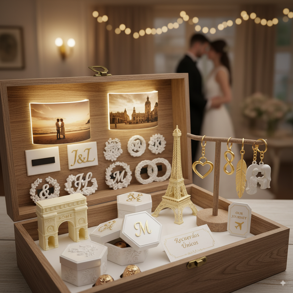 Descubre recuerdos de boda únicos y personalizados creados con impresión 3D: llaveros, litofanías, toppers, mini figuras y más.